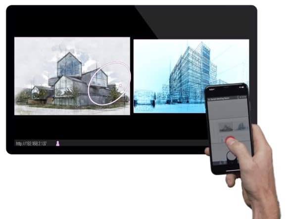 Solstice Ink erlaubt die Nutzung eines Smartphones als virtuellen Laserpointer, mit dem Aspekte der Präsentation verdeutlicht werden können. (Bild: Mersive)