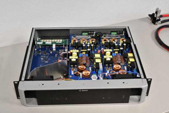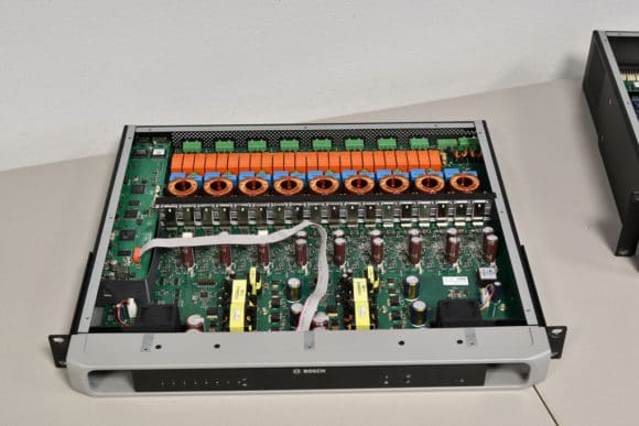 Aufgebaut sind die Praesensa-Verstärker als Class-D-Endstufen mit Direct Drive für 70Vund für 100V-Systeme. Die Verstärker arbeiten ohne Übertrager im Ausgang, was nicht nur erhebliche Kosten und Gewicht einspart, sondern auch der Audioqualität zugutekommt. Die galvanische Trennung wird durch die DC/DC-Konverter in der Stromversorgung erreicht.
