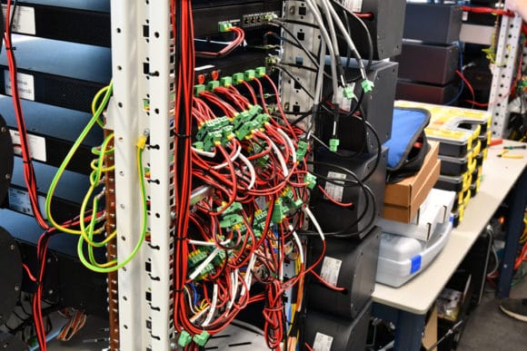 Laboraufbau mit Sprechstellen. Ganz unten in den Racks sieht man die externen PRAES8PS2-Switche und PRAPSM48(24)-Netzteile zur Montage auf Hutschienen sowie einige EOL-Module (rot). (Bild: Anselm Goertz)