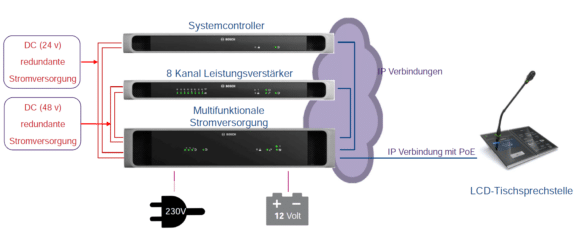In den dort angeschlossenen Verstärkern und Controllern sind wiederum die DC/DC-Konverter für die interne Versorgung redundant. Die Sprechstellen werden im Loop verkabelt und so redundant über PoE versorgt.