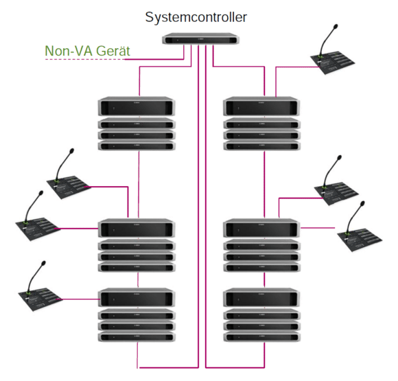 Für Signale, die außerhalb der Sprachalarmierung eingespeist werden sollen, z. B. Hintergrundmusik, kann ein Port für „Non-VA“ Quellen genutzt werden. Die Konfiguration und das File-Management des Systemcontrollers erfolgen über einen integrierten Webserver, der über einen herkömmlichen Browser angesprochen werden kann. Ebenso wie die Multifunktionale Stromversorgung verfügt auch der Systemcontroller über einen integrierten Switch für das OMNEO Netzwerk, der das „Rapid Spanning Tree Protocol“ unterstützt.