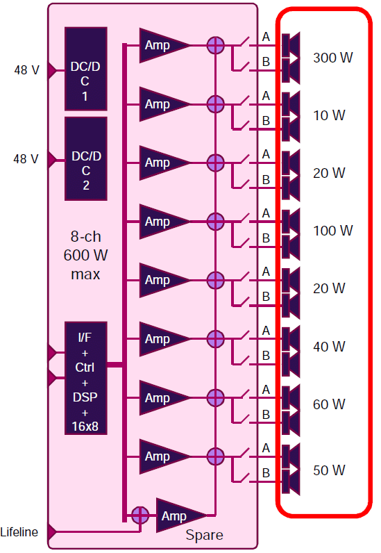 Fallen beide Netzwerkverbindungen zum oder im Verstärker aus, dann übernimmt Lifeline die Signalübertragung, die im Verstärker direkt und ausschließlich unter Umgehung sämtlicher Signalverarbeitung auf den Havarieverstärker geht.