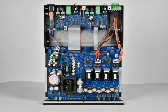 Innenansicht des AMP-X300. Vorne links befindet sich das Schaltnetzteil, rechts davon auf der gleichen Platine die vier Endstufenkanäle. An der Rückwand des Gehäuses befindet sich die Platine mit der Eingangsschaltung. (Bild: Anselm Goertz)