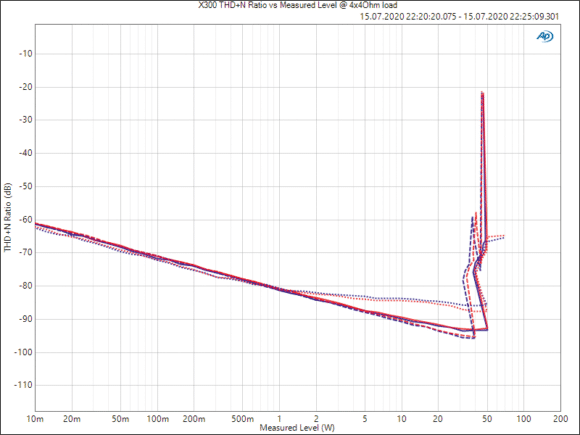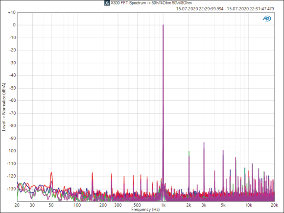 Crestron AMP-X300 Klirrspektrum bei 4 × 50 W leistung an einer Last von 4 ×