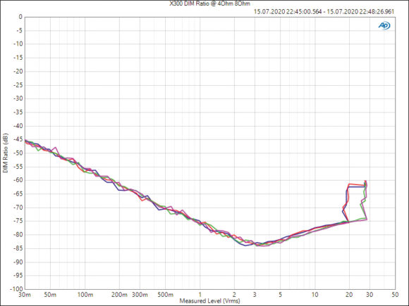 Crestron AMP-X300 Transient Intermodulationsverzerrungen (DIM100) in Abhängigkeit von der Ausgangsspannung