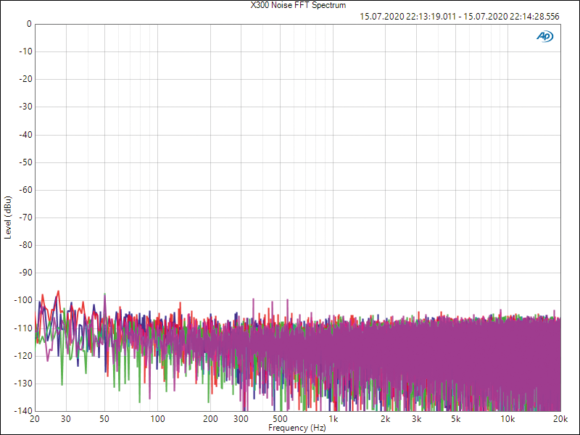 Der an den Ausgängen des AMP-X300 zu messende Störpegel beträgt –70 dBu unbewertet und –72 dBu mit A-Bewertung. Das FFT Spektrum des Störsignals in ABB. 04 zeigt zudem nur gleich verteiltes Rauschen ohne monofrequente Anteile. Setzt man die maximale Ausgangsspannung im Low-Z-Modus von ca. 34 dBu in Relation zum Störpegel, dann ergibt sich daraus ein S/N (Störabstand) von guten 106 dB.