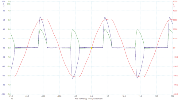 Crestron AMP-X300 Verlauf von Netzspannung(rot), Netzstrom(blau) und der daraus berechneten Leistungsaufnahme(grün)