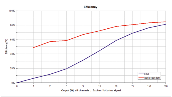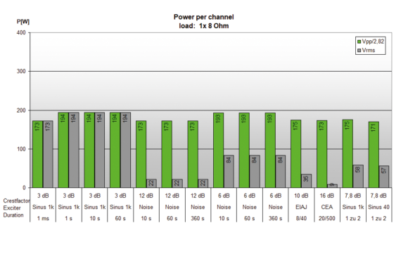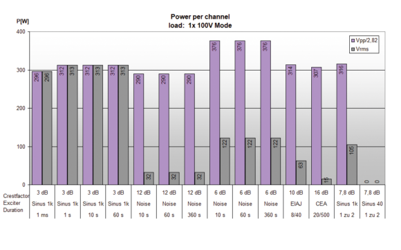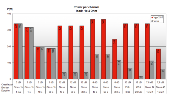 Da neben der Leistungsbegrenzung des Netzteils auch noch die maximale Ausgangsspannung und der Ausgangsstrom der Endstufen selbst eine Rolle spielen, gibt das Datenblatt des AMP-X300 als einkanalige Höchstleistung an 8 Ω 150 W und an 4 Ω 200 W an. Die Labormessungen ergaben mit einem konstanten Sinussignal dazu Werte von 194 bzw. 188 W jeweils nach einer Minute. Für den 100V-Modus weist das Datenblatt 300 W aus, die in der Messung mit 312 W noch etwas übertroffen wurden.
