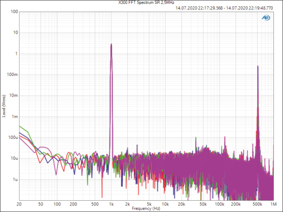 Beides ist soweit nichts Ungewöhnliches und wäre so bei jedem PWM-Verstärker messbar. Interessant wird es dazwischen, wo im Frequenzbereich bis 20 kHz nur winzige Anteile harmonischer Verzerrungen k2 und k3 zu erkennen sind und sonst lediglich gleich verteiltes Rauschen mit geringem Pegel. Einzelne monofrequente Peaks (idle tones), die besonders störend sein können, gibt es nicht. Auch oberhalb von 20 kHz bleibt das Spektrum „sauber“, wo sich nur zwei kleine Linie minimal hervorheben. Insgesamt somit ein perfektes Bild.