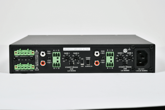 Ein zentraler Schalter ermöglicht die Umschaltung zwischen dem Low-Z (niederohmig)- oder High-Z(70/100V)-Modus. Bei letzterem gehen je zwei Kanäle in den Brückenmodus, so dass dann insgesamt nur noch zwei Verstärkerkanäle zur Verfügung stehen. Die Brückenschaltung ist auch im Low-Z Modus möglich und kann dann individuell für Kanal 1&2 und 3&4 geschaltet werden. Eine weitere Einstellung im Low-Z-Modus ist die Summenfunktion, wo die Eingangssignale zunächst zu einer Mono-Summe addiert und dann beiden Endstufen zugeführt werden.