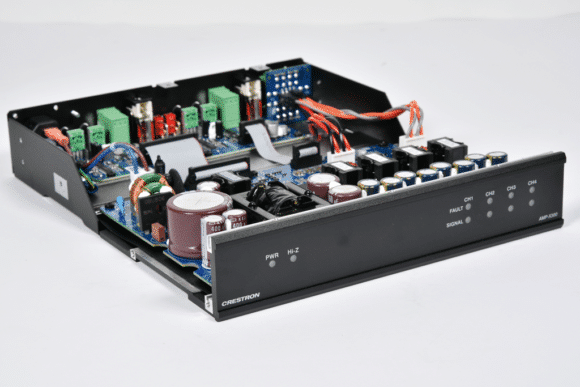 Heute bietet man ähnlich wie auch Hypex oder Pascal eine Vielzahl von Class-D-Modulen in allen Leistungsklassen an, die von vielen namhaften Marken im High-End-Sektor genutzt werden, zu denen jetzt auch Crestron gehört. Im hier vorgestellten AMP-X300 befinden sich vier Endstufenkanäle mit maximal 300 W Leistung in der Summe. Das kompakte 9,5″-Gerät kommt ohne Lüfter aus und kann daher auch an akustisch sensiblen Stellen, z. B. unter oder hinter einem Bildschirm installiert werden.