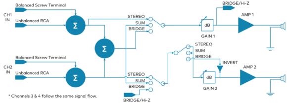 ABB. 01: Blockschaltbild von zwei Kanälen im AMP-X300 (Bild: Crestron)