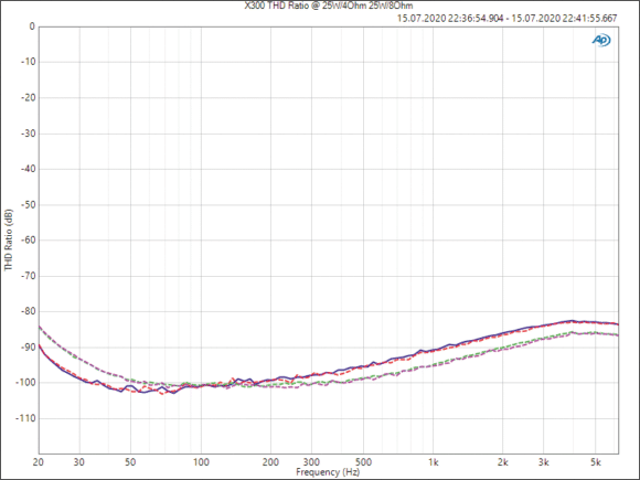 ABB. 09: Verzerrungen (THD) in Abhängigkeit von der Frequenz, gemessen bei 4 × 25 W Leistung an einer Last von 4 × 4 Ω (bl,rt) und 4 × 8 Ω (gr,ma). Messung exemplarisch für  Kanal 1 und 2. (Bild: Anselm Goertz)