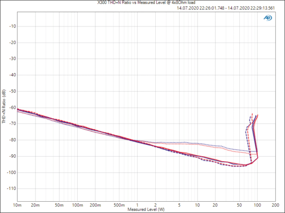 Crestron AMP-X300 Verzerrungen (THD+N) in Abhängigkeit von der Ausgangsleistung