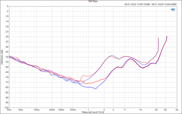 ABB. 10: Transiente Intermodulationsverzerrungen (Dim) für Kanal 1 (bl) und 2 (rt) in Abhängigkeit von der Ausgangsspannung (x-Achse) für eine Last von 2× 4 Ω (durchgezogene Linien) und 2× 8 Ω (gestrichelte Linien) (Bild: Anselm Goertz)