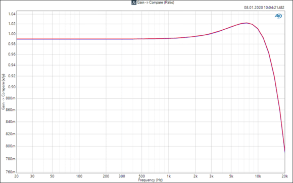 ABB. 02 zeigt den Quotienten der beiden Messungen für den XPA U 1002 mit einer 8-Ω-Last. Über einen weiten Frequenzbereich liegt der Wert bei 0,99, woraus sich ein Dämpfungsfaktor von 100 berechnet. Oberhalb von 3 kHz erreicht die Kurve jedoch einen Wert größer 1, d. h., die Ausgangsspannung steigt bei angeschlossener Last geringfügig an, was eigentlich nicht sein kann.