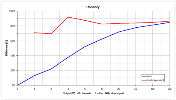 Zusammen mit der Grundlast ergeben sich bei kleinen Ausgangsleistungen für den Wirkungsgrad eher geringe Werte. Für die rote Kurve wird die Ausgangsleistung nur zu der zusätzlich zur Grundlast aufgenommenen Leistung in Relation gesetzt. Die Endstufe selbst kommt so ohne Grundlast durchgängig auf einen Wirkungsgrad von 80% und mehr. Die Messwerte bei sehr kleinen Leistungen unter 10 W sind mit einer gewissen Ungenauigkeit behaftet, so dass es zu Unstetigkeiten in den Kurven kommen kann.