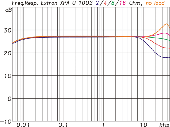 Beginnen wir dazu mit ABB. 01 und dem Frequenzgang des XPA U 1002. An den Kurven erkennt man bereits, dass sich der Frequenzgang durchaus ein wenig ändert, und zwar in Abhängigkeit von der angeschlossenen Last.