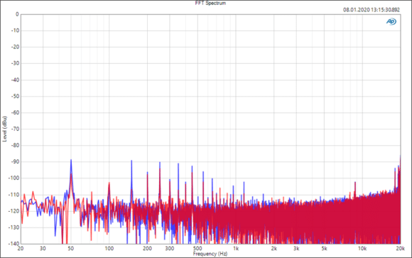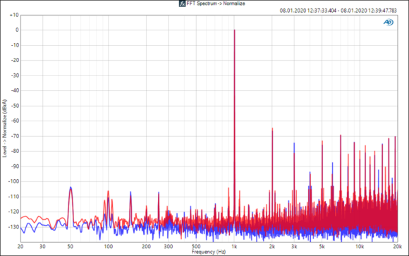 ABB. 09: FFT-Spektrum Kanal 1 (bl) und 2 (rt) für ein 1-kHz-Sinussignal bei 2×50 W Leistung an 4 Ω (Bild: Anselm Goertz)