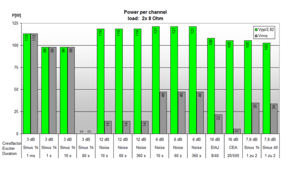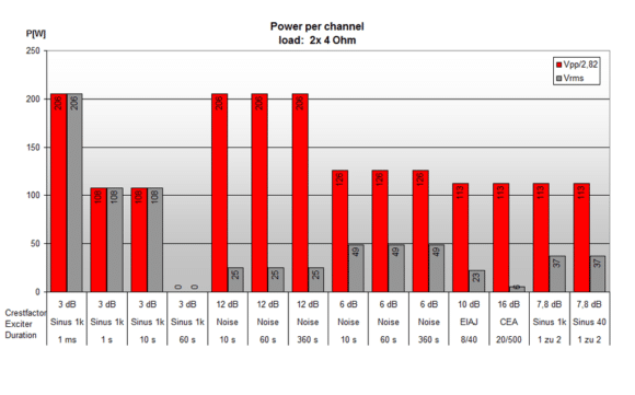 Reduziert sich der Crestfaktor auf 6 dB, dann sind es noch 126 W an 4 Ω und 120 W an 8 Ω. Die mittlere Leistung beträgt dann ca. 50 W pro Kanal. Die verschiedenen Burst-Messungen liefern an 4 Ω und an 8 Ω Leistungen zwischen 103 und 113 W.