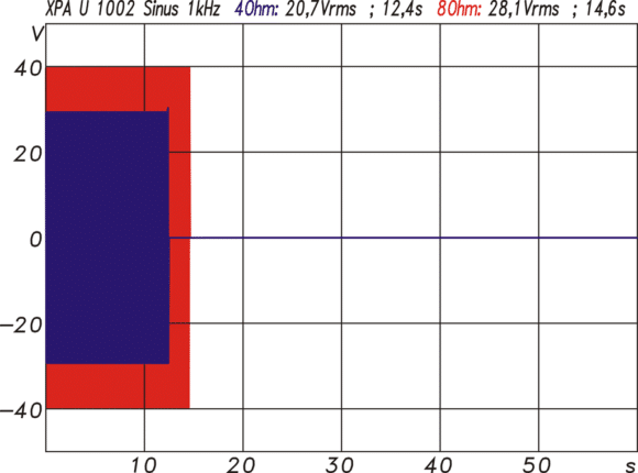 ABB. 13: Verhalten der XPA U 1002 bei einem konstant anliegenden Sinussignal für maximale Ausgangsleistung an 2× 4 Ω (bl) und an 2× 8 Ω (rt) (Bild: Anselm Goertz)