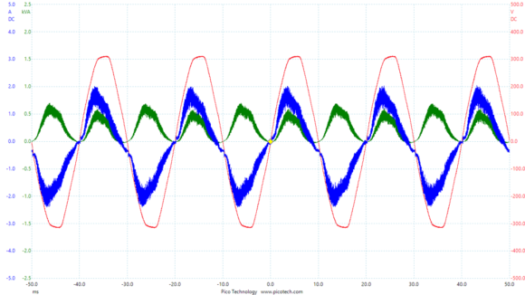 ABB. 15: Verlauf von Netzspannung (rot), Netzstrom (blau) und der daraus berechneten Leistungsaufnahme (grün) mit einem rms-Wert von 253 VA. Der Leistungsfaktor beträgt 0,94 und der cos-?-Wert 0,96.