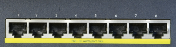 Netzwerkanschlüsse eines PoE+-Switches mit acht Anschlüssen, die je maximal 30 W zur Verfügung stellen können (Bild: Anselm Goertz)