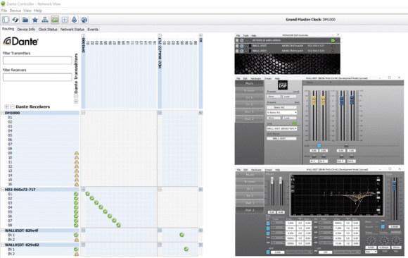 ABB. 02: Links die Audinate Dante Controller Software, in der den Lautsprechern das gewünschte Signal zugeordnet wird. Rechts die Monacor DSP-Controller-Software (Bild: Anselm Goertz)