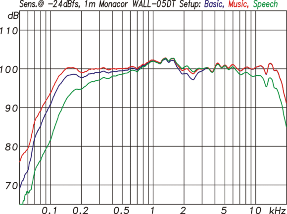 ABB. 06: Frequenzgang der WALL-05DT mit den Setups Basic(bl), Music(rt) und Speech(gr). In der Einstellung Music reicht der Frequenzgang (-6 dB) von 100 Hz bis 19 kHz mit einem insgesamt sehr gleichmäßigen Verlauf. (Bild: Anselm Goertz)