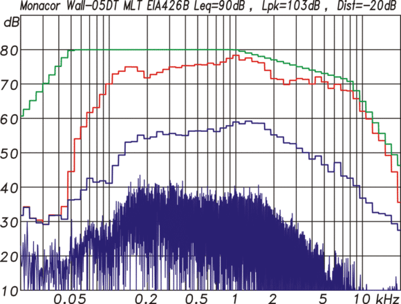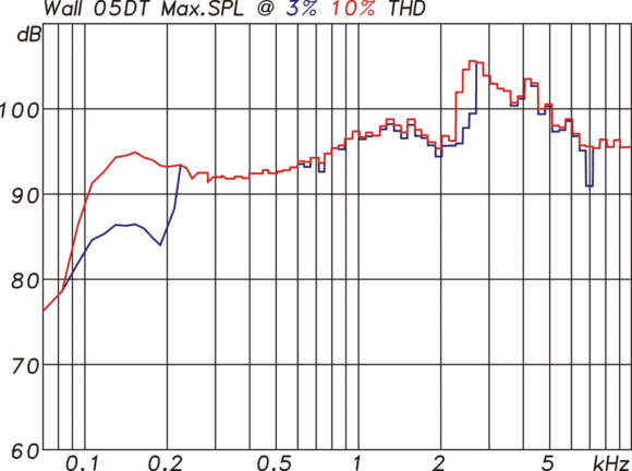ABB. 11 zeigt das Ergebnis für die WALL-05DT mit der roten Kurve gemessen von 70 Hz bis 10 kHz für maximal 10 % Verzerrungen und mit der blauen Kurve für maximal 3 % Verzerrungen. Anhand dieser Messung würden sich mögliche Schwächen in bestimmten Frequenzbereichen gut erkennen lassen, die es hier jedoch nicht gibt. Die Kurven verlaufen gleichmäßig ohne Schwachstellen und werden primär durch den internen Limiter begrenzt. Die 10 %-Kurve separiert sich auch nur kurz von der 3 %-Kurve, da höhere Verzerrungswerte als 3 %, wenn überhaupt, nur unterhalb von 200 Hz auftreten. Insgesamt sind die erreichten Pegelwerte vergleichsweise gering, wobei jedoch zu bedenken ist, dass es sich hier um einen kleinen 5″ Lautsprecher mit nur 10 W Verstärkerleistung handelt. Dafür ist das Ergebnis dann wieder als gut zu bewerten.