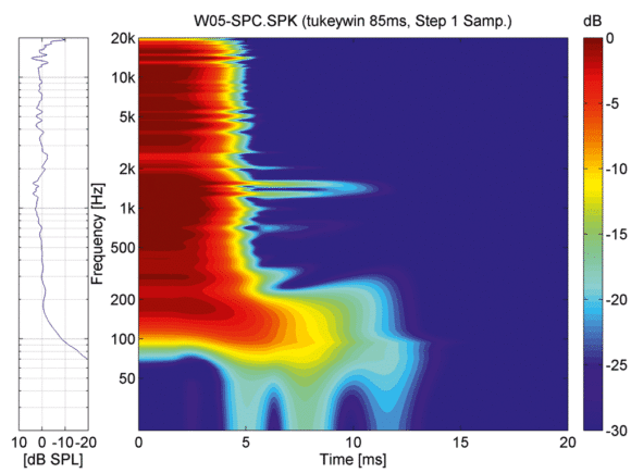 Erfreulich gut stellt sich auch das Spektrogramm der WALL-05DT aus ABB. 08 dar. Lediglich zwischen 1 und 2 kHz schauen zwei kleine Gehäuseresonanzen hervor. In puncto Frequenzgang und Abstimmung kann man somit zufrieden sein.