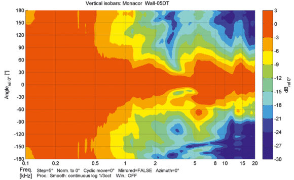 Die entsprechenden Messungen mit Isobaren für die horizontale und vertikale Ebene zeigen ABB. 09 und ABB. 10. Als nomineller Abstrahlwinkel wird der Winkel bezeichnet, bei dem der Pegel gegenüber der Mittelachse um 6 dB (Halbierung) abgefallen ist. Für die WALL-05DT beträgt dieser Winkel horizontal und vertikal oberhalb von 1 kHz im Mittel ca. 120° (±60°). Durch den Aufbau des 2-Wege-Systems mit übereinander angeordneten Hoch- und Tieftönern kommt es in der vertikalen Ebene durch winkelabhängige Laufzeitunterschiede im Bereich der Trennfrequenz, wo beide Wege Schall abstrahlen, unweigerlich zu einem etwas unruhigeren Verlauf.