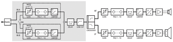 Welcher Funktionsumfang insgesamt im DSP steckt, zeigt das Blockschaltbild aus ABB. 03. Zwei Eingänge verfügen über ein komplettes Signalprozessing und werden dann aufaddiert. Danach folgen Delay, LowCut und die X-Over-Filter für die beiden Ausgangswege. Dabei lassen sich für jeden Ausgang alle üblichen Typen von Hoch- und Tiefpassfiltern einstellen. Des Weiteren gibt es dann nochmal je zehn vollparametrische EQs, Delay, Gain und Limiter. Einer vollständig Abstimmung für die angeschlossenen Lautsprecher steht somit nichts im Wege.